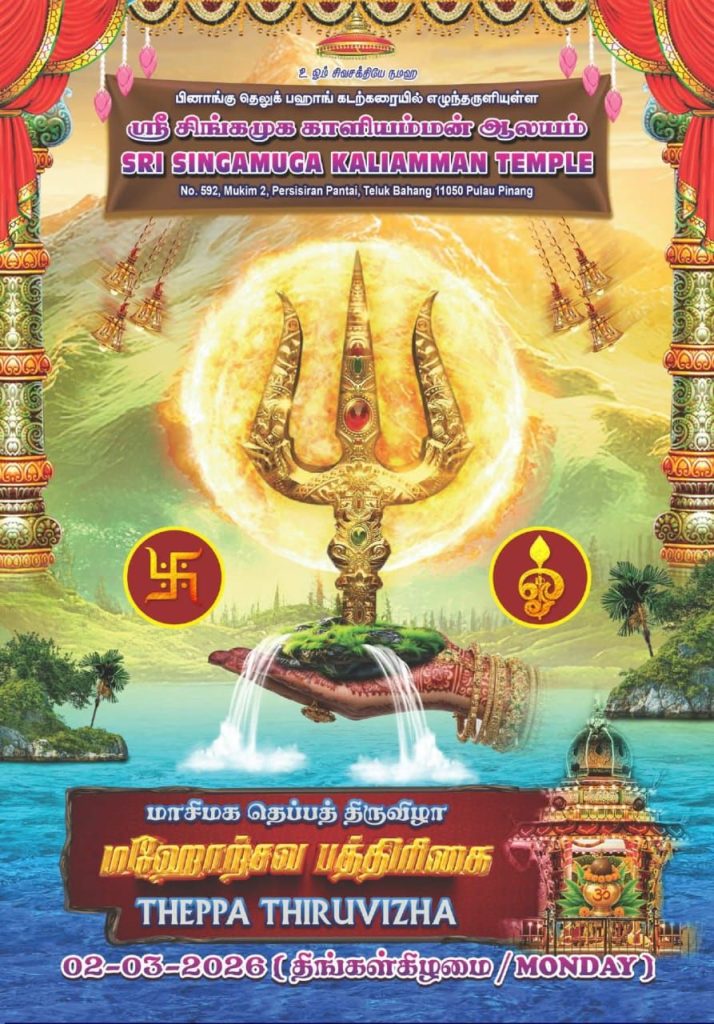 Year 2026 Masi Magam Teppa Thiruvizha (sea chariot) at penang will be on 2nd March 2026 Evening at Singamuga Kaliamman Temple, Teluk Bahang, Pulau Pinang.