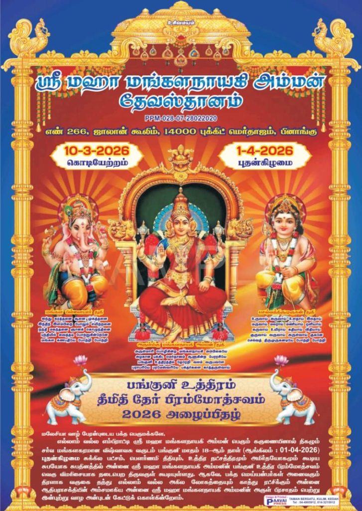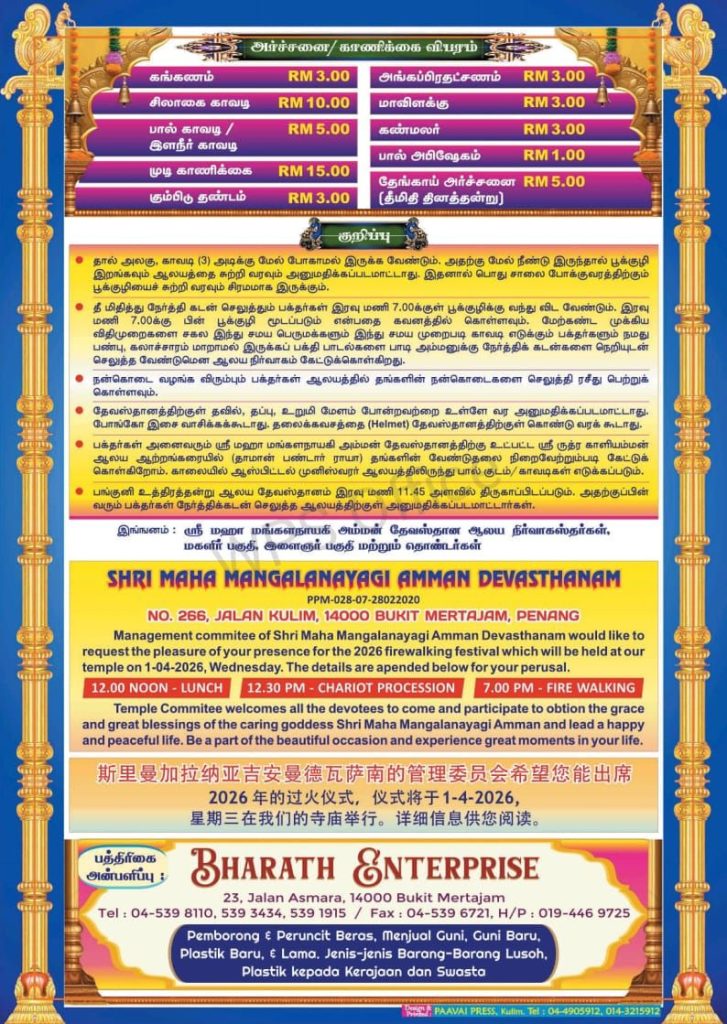 Bukit Mertajam, Shree Mangalanayagi Amman Temple having Thimithi Thiruvizha on 1st April 2026